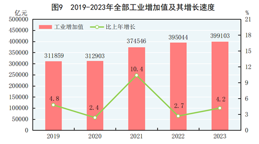 全年全部工业增加值399103亿元,比上年增长4.2%。规模以上工业增加值增长4.6%。在规模以上工业中,分经济类型看,国有控股企业增加值增长5.0%;股份制企业增长5.3%,外商及港澳台商投资企业增长1.4%;私营企业增长3.1%。分门类看,采矿业增长2.3%,制造业增长5.0%,电力、热力、燃气及水生产和供应业增长4.3%。