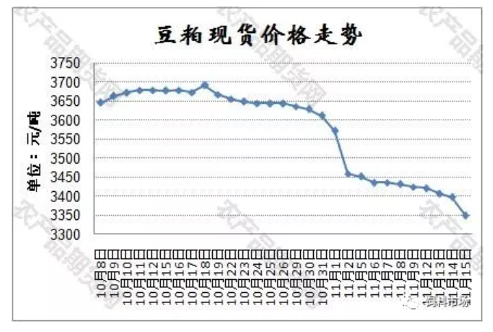 国庆节 假后,玉米价格继续上涨,加上全国各地气温的逐渐下降,养殖端对饲料需求上量,运费价格也出现了上调,在这些因素影响下,不少饲料企业以成本增加为由调高了价格。与玉米不同的是,自国庆长 假后,国内豆粕现货 价格就出现了弱势下行的趋势,豆粕期价跌幅就更加明显,主力1901合约在10月USDA月度供需报告前达3539元/吨的高位后震荡下行,在11月初大幅受挫,截止目前最低已跌至3034元/吨,近一个月内高低价差达500元/吨,而国内大中规模的油厂43%蛋白豆粕报价在3660元/吨,在10月中旬后开始偏弱,特别是11月2日出现大幅下滑,单日跌幅达120元/吨,后期延续偏弱运行,截止目前已经跌至3350元/吨,前后跌幅超300元/吨,为何在 下游养殖需求逐渐好转之际 ,豆粕价格却节节败退?