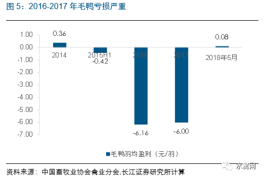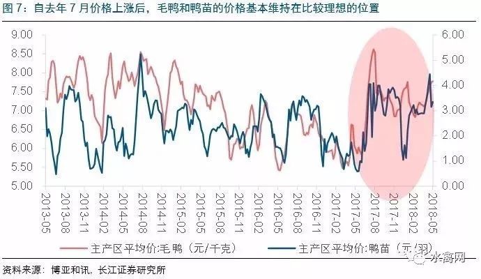 我们认为,种鸭存栏量下降的背景下,2018年肉鸭出栏量预计将进一步下滑,鸭价景气有望持续。白羽肉鸭的生长周期与白羽肉鸡类似,祖代和父母代种鸭都是第26周开始产蛋、到第76周左右淘汰,祖代到商品代毛鸭的最短传导时间为67周。2017年全国祖代和父母代白羽肉种鸭存栏量同比均下降,因此我们认为2018年商品代毛鸭的供给相对2017年将进一步减少,行业供需格局将从供给过剩转向供给短缺。自去年7月毛鸭、鸭苗价格开始上涨后,毛鸭和鸭苗的价格基本维持在比较理想的位置,2018年1-5月商品代鸭苗均价2.76元/羽,同比上涨26.4%,商品毛鸭均价7.32元/千克,同比上涨14.2%,毛鸭和鸭苗都成功扭亏。2018年商品代毛鸭产能预计缩减,因此当前的景气行情有望持续。