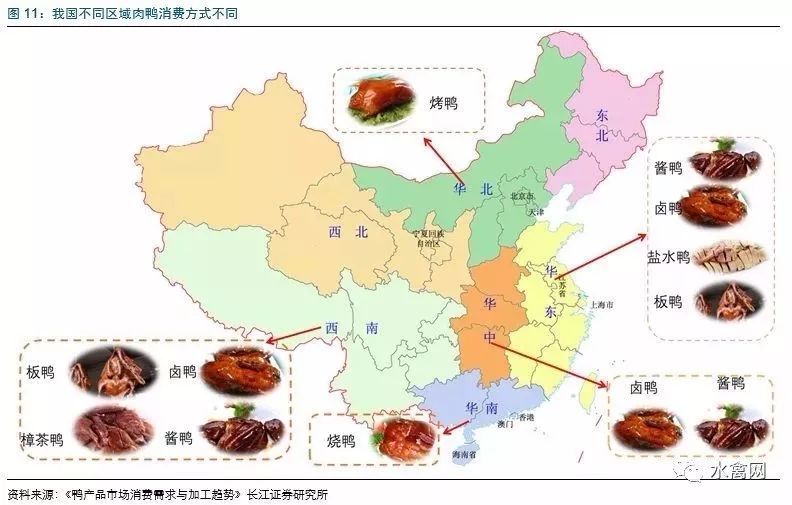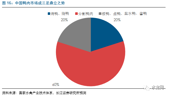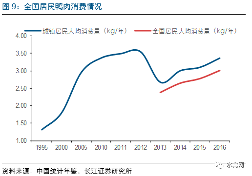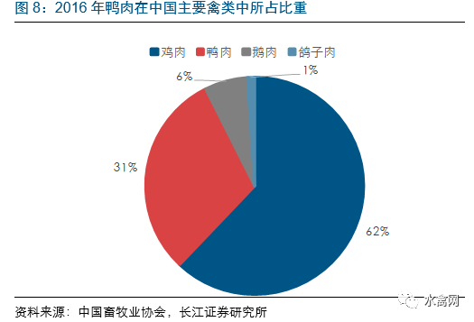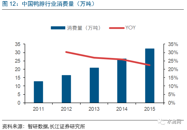 鸭肉为除鸡肉外禽肉的主要消费品种,近年来消费量持续提升。目前,我国的禽肉人均占有量约为14千克/人,其中鸭肉约为5千克/人。目前肉鸭消费市场的结构方面,预计烤鸭、烧鸭市场约占我国总消费量15%~20%;分割鸭肉市场约占55%~60%;板鸭、卤鸭、咸水鸭、酱鸭等市场约占20%~25%。预计随着消费水平的提升以及消费习惯的逐步改变,预计未来鸭肉消费量将呈现持续增长。同时,近年来肉鸭产业休闲食品行业如鸭脖等规模快速增长,也将进一步带动肉鸭行业需求,2011-2015年鸭脖行业消费量年复合增速约25%。