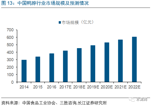 近年来鸭产业休闲食品行业规模快速增长,进一步带动行业需求。其中主要产品为鸭脖,在周黑鸭、绝味鸭脖以及煌上煌等企业的全国化大力扩张下,鸭脖制品迅速推广全国市场,我国鸭脖行业初步形成“三鸭争霸”的市场格局。2017年以来,网购物流的快速发展使得鸭脖线上销售规模爆发式增长。2016年国内休闲卤制食品市场规模超过了2230亿,其中,鸭脖的零售市场年销售额突破380亿元,市场规模进一步扩大。