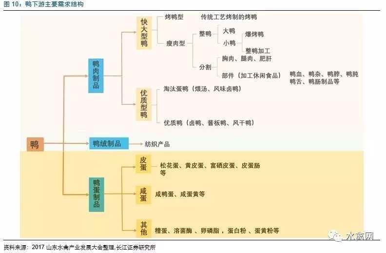 鸭肉为除鸡肉外禽肉的主要消费品种,近年来消费量持续提升。目前,我国的禽肉人均占有量约为14千克/人,其中鸭肉约为5千克/人。在需求结构上,鸭的下游产品主要包括生鲜冻品鸭肉、熟食鸭肉制品、鸭毛制品、鸭蛋制品等。生鲜冻品主要流向零售商和餐饮服务商。按消费习惯,可将鸭肉制品分为活鸭、整鸭和分割产品。其中活鸭包括麻鸭和南方“水鸭”;整鸭包括北京烤鸭等;分割产品包括胸腿肉等。