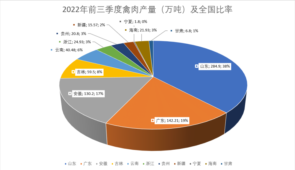 山东、广东、安徽分别为禽肉产量前三位,山东一省的禽肉产量远远甩开其他区域。