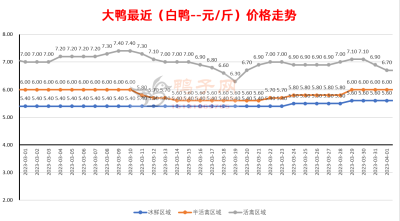 白鸭:活禽区域大鸭局部下跌; 半番(M18):局部上涨; 麻鸭:区域性调整; 随着清明假期的到来,活禽有一定的消费预期,麻鸭、半番价格局部上涨,白鸭下跌或也比较有限了。