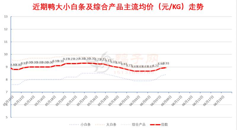 白鸭苗报价上涨,活禽大鸭强势反弹,半番鸭苗下跌,其他稳,结构性矛盾空前状态,分割产品相对偏弱,白条上涨。