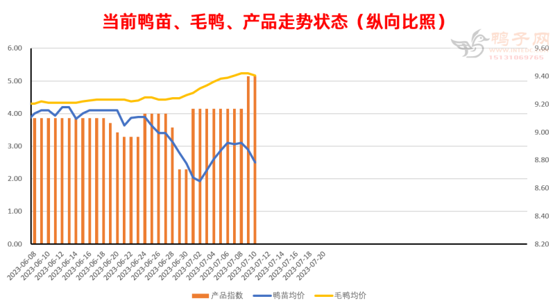 当前鸭苗和毛鸭、产品均处于背离状态,并且鸭苗和毛鸭剪刀口放大。