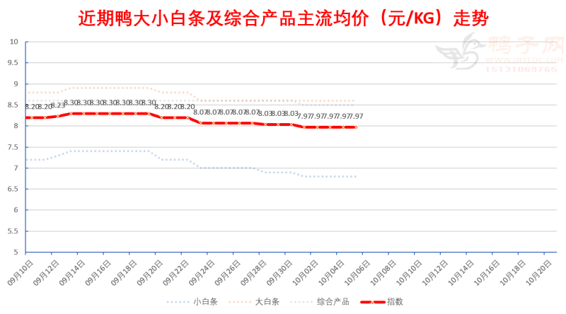 白鸭:稳; 半番(M18):稳; 麻鸭:稳; 活禽大鸭若运作良好,可以坚持到“台风鸭”出栏后。当前价格尚可,但销量相当低迷。