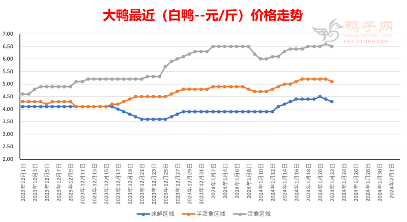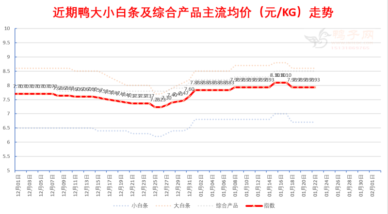 白鸭:局部下跌; 半番(M18):稳; 麻鸭:局部上涨,补涨; 结构性调整,当前麻鸭处于价值洼地。活禽区白鸭处于强势状态已有一段时间了,随着春节假日的来临,局部价格或会出现较为混乱的情况,历年如此。