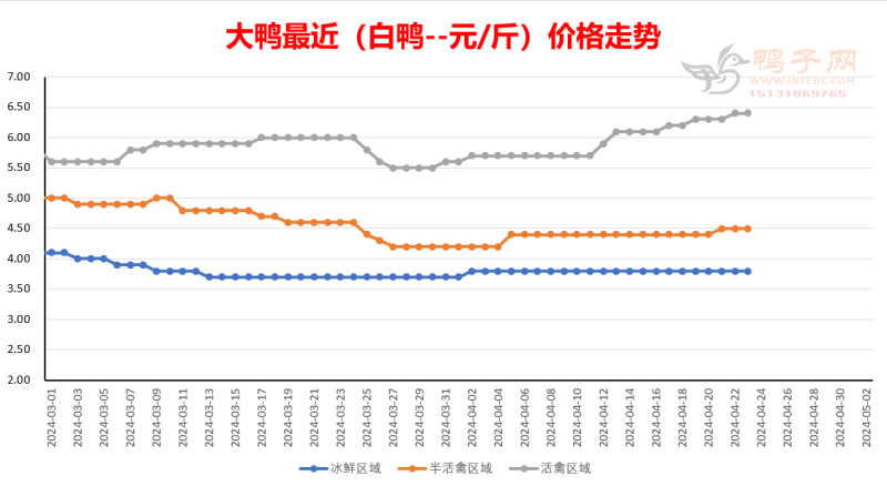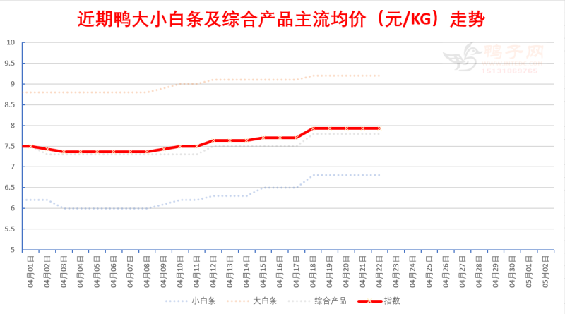 今天鸭苗报价稳,种蛋报稳,当前白鸭苗和麻鸭苗、半番苗的结构性差价极大。养殖环节活禽旱白鸭报价下跌,半番、麻鸭弱态。五一备货结束,鸭产品走货平淡,相对稳,终端与上游衔接失调。关联品生猪微跌、鸡蛋稳、豆粕涨、玉米跌。