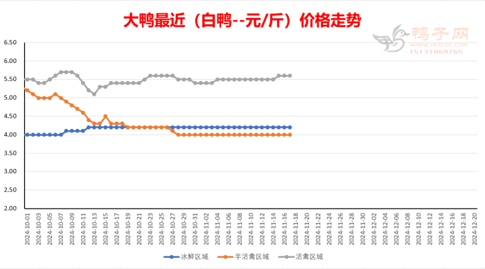 白鸭:活禽区上涨; 半番(M18):稳; 麻鸭:稳; 白鸭上涨,活禽销量一般。