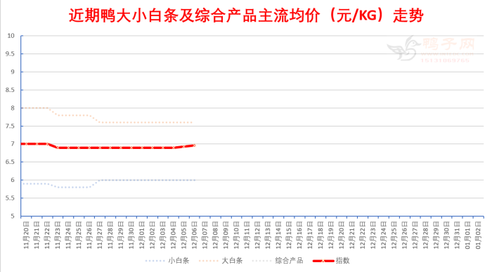 今天鸭苗报价稳,种蛋报稳,实蛋孵化尚可,包苗保价交易多为短线或预售,整体状况和昨日比较氛围变化不大。养殖环节白鸭活禽龙头企业报价零星下滑,白鸭整体走弱,其他品类相对稳。分割产品个别单品价格上涨明显,元旦(或春节需求)备货,低价在某种程度上也刺激消费,从第三方平台获悉成品羽绒羽毛报价再次下跌。